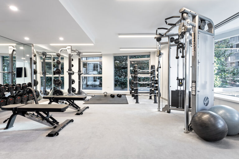 A well-equipped fitness centre designed in collaboration with Elite Performance offers a bright and private space to focus on health and wellness.